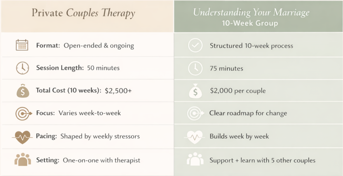 Traditional weekly couples therapy is incredibly valuable. It can also be a slower, more open-ended process often shaped by week-to-week stressors, scheduling interruptions, and whichever crisis feels loudest that day.